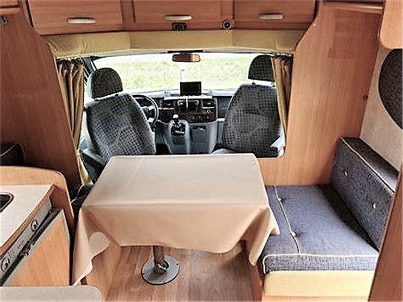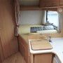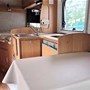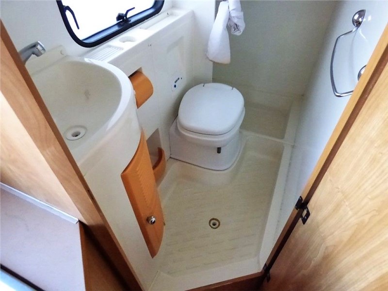 Dinette con tavolo centrale divanetti contrapposti e sedili cabina girevoli, cucina a elle, letto matrimoniale alla francese, bagno con doccia separata.